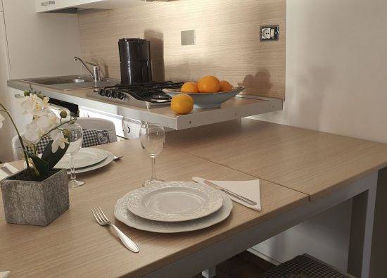 - Wohnzimmer mit Schlafcouch für 2 Personen, Essbereich, Kochnische mit Spülmaschine und Kaffeemaschine, großemöblierte Terrasse